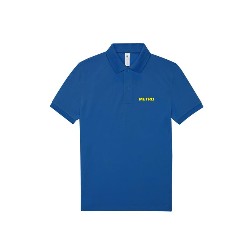 Men's classic cotton polo shirt with METRO logo print.Combed, ring-spun cotton.Button placket with colour coordinated buttonsNeckbandFlat knit collar and cuffsReinforced shoulder seamSpare button in seamDouble seam at waistbandSide slits